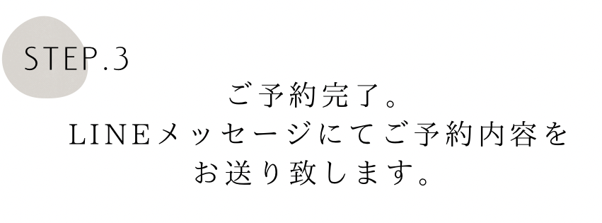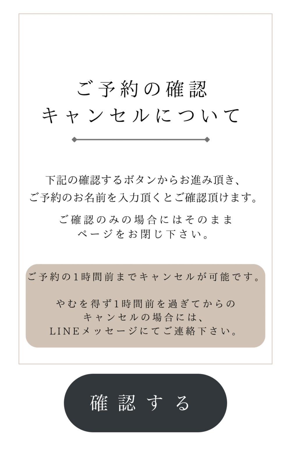 ※施術中や日中(〜15時)は、メッセージ送信までお時間を頂く場合がございます。すぐにご予約内容をご確認頂く場合やキャンセルの場合、LINE下部メニューの【ご予約の確認・キャンセル】ボタンからご予約時のお名前をご入力頂きご確認下さい。